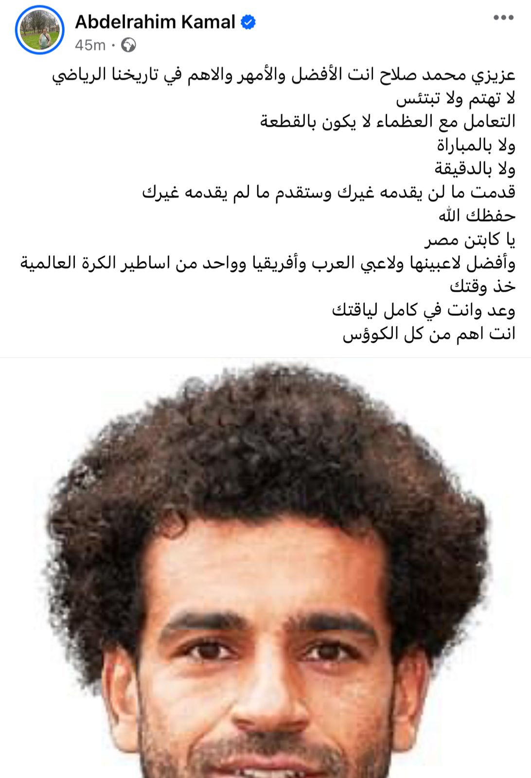 وكتب عبد الرحيم منشورًا، عبر حسابه الشخصي بموقع التواصل الاجتماعي فيسبوك، وقال:عزيزي محمد صلاح أنت الأفضل والأمهر والأهم في تاريخنا الرياضي.. لا تهتم ولا تبتئس التعامل مع العظماء لا يكون بالقطعة ولا بالمباراة ولا بالدقيقة قدمت ما لن يقدمه غيرك وستقدم ما لم يقدمه غيرك.. حفظك الله يا كابتن مصر.