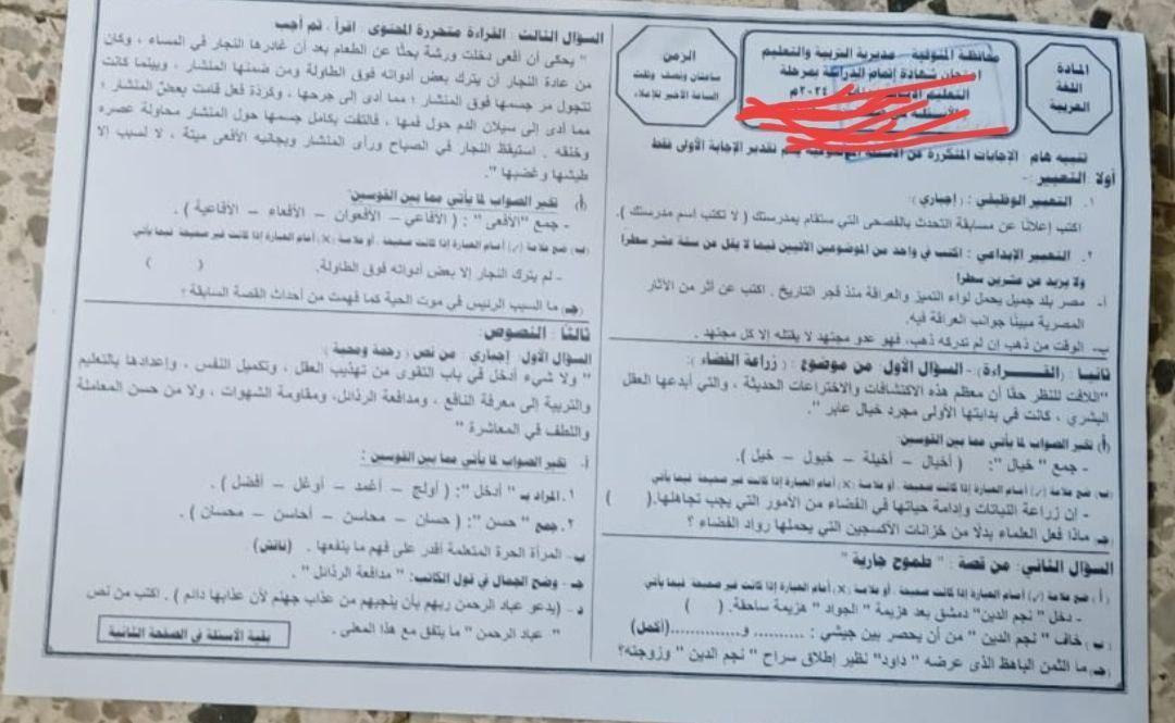 تداول عدد من الأهالي والطلاب ورقة منسوبة لامتحان اللغة العربية للشهادة الإعدادية بالمنوفية، بعد دخول الطلاب للامتحانات اليوم، على وسائل التواصل الاجتماعي.