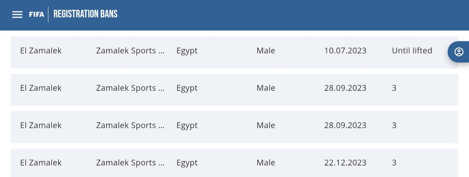 وبعد التحديث الأسبوعي للمنصة الخاصة بالقيد والتابعة لـ فيفا، ظهر استمرار إيقاف قيد الزمالك بسبب قضية واحدة بتاريخ 22-12-2023، والتي حُكم فيها بوقف القيد لمدة 3 فترات تسجيل.