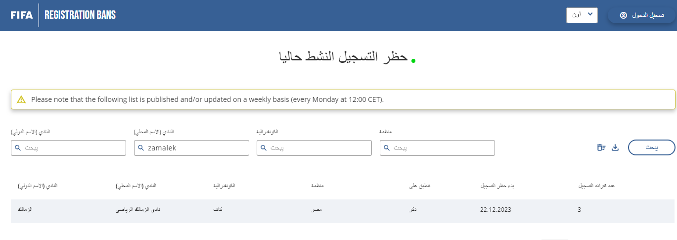 أظهرت منصة الاتحاد الدولي لكرة القدم فيفا، استمرار إيقاف قيد نادي الزمالك خلال فترة الانتقالات الشتوية الحالية ولمدة 3 فترات تسجيل.