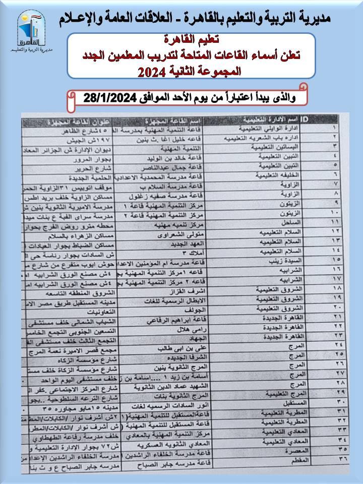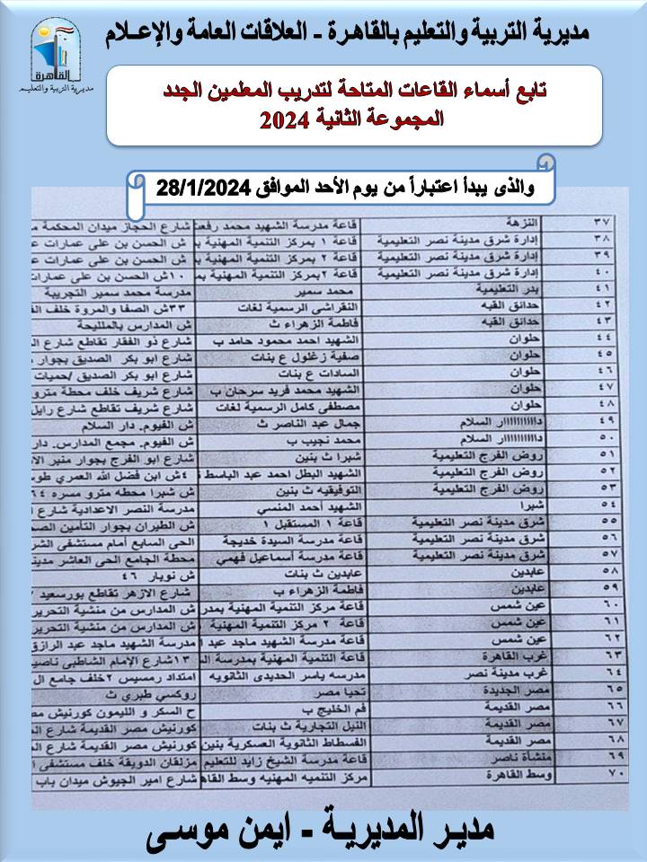 أعلنت مديرية التربية والتعليم بالقاهرة، برعاية أيمن موسى، وكيل أول الوزارة - مدير المديرية، وتحت إشراف إيهاب الناغى، مدير إدارة التدريب، أسماء القاعات المتاحة لتدريب المعلمين الجدد ( المجموعة الثانية ) لعام 2024 والذى يبدأ اعتبارًا من يوم الأحد 2024/ 1/28 في تمام الساعة التاسعة صباحًا،موضحة أنه سوف يتم التواصل تليفونيا بالمتدربين من قبل إدارة التدريب بالمديرية.