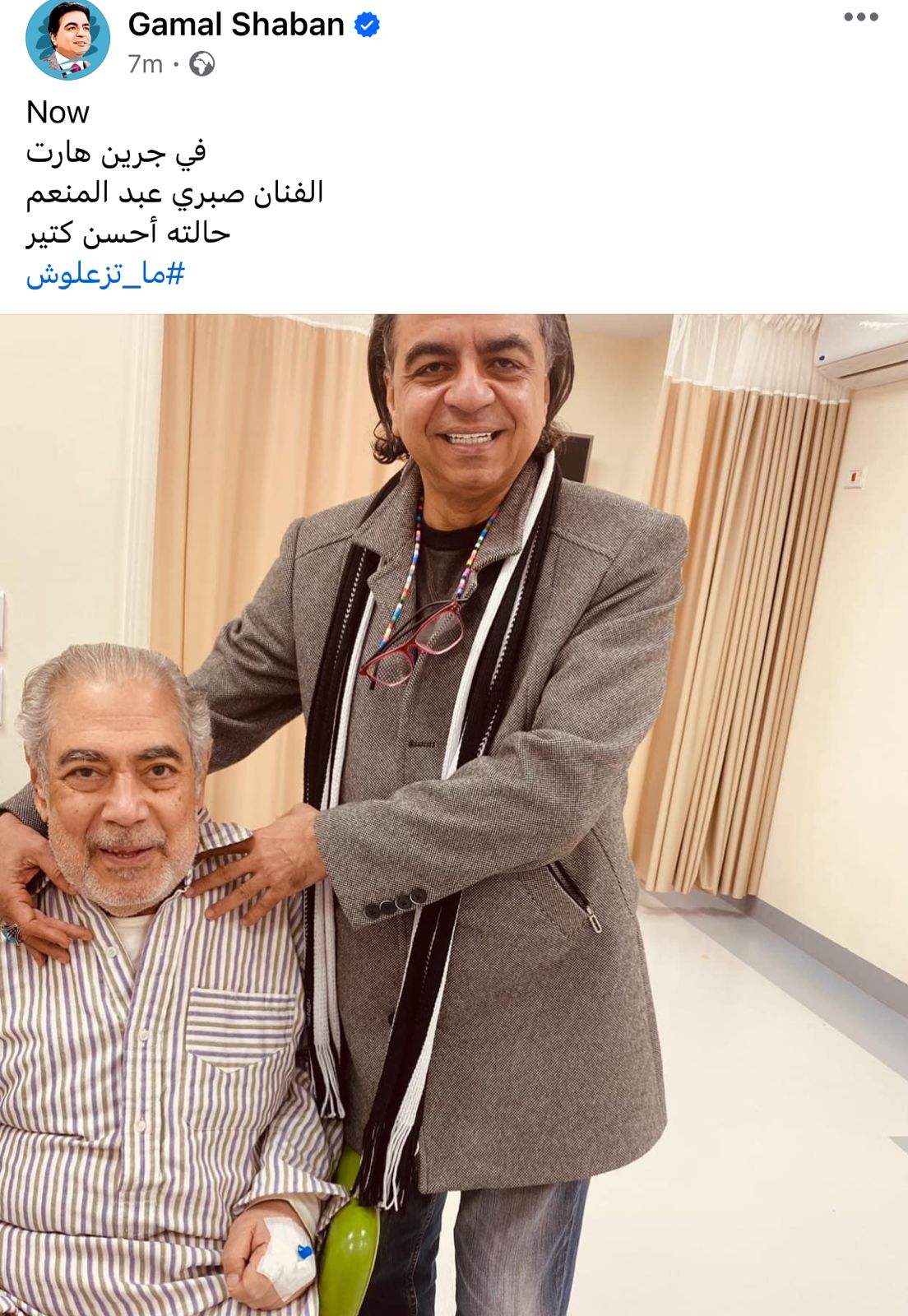 ونشر جمال شعبان، صورة للفنان صبري عبد المنعم، عبر حسابه الشخصي بموقع التواصل الاجتماعي فيسبوك، وعلق عليها قائلًا: الفنان صبري عبد المنعم حالته أحسن كتير.