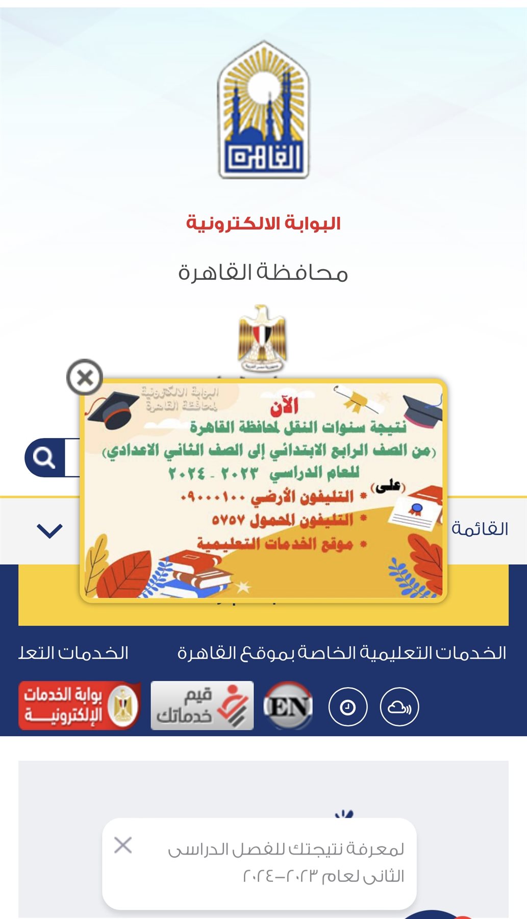 بعد الضغط علي الرابط التالي، يستطيع الطلاب الدخول علي موقع مديرية التربية والتعليم محافظة القاهرة، والبحث عن نتيجة الصف الثاني الإعدادي الترم الأول 2024، حيث ترفع محافظة القاهرة نتيجة الفصل الدراسي الأول على موقع مديرية التربية والتعليم، وتكون نتيجة الفصل الدراسي الأول غير مضاف إليها درجات أعمال السنة.