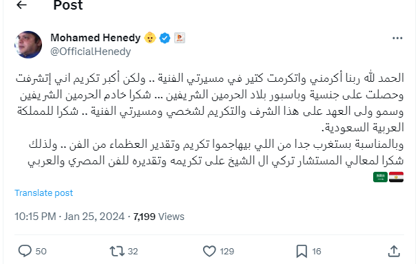 ونشر الفنان محمد هنيدي عبر حسابه على إكس، تويتر سابقًا: الحمد لله ربنا أكرمني واتكرمت كتير في مسيرتي الفنية.. ولكن أكبر تكريم إني اتشرفت وحصلت على جنسية وباسبور بلاد الحرمين الشريفين.. شكرا خادم الحرمين الشريفين وسمو ولى العهد على هذا الشرف والتكريم لشخصي ومسيرتي الفنية.. شكرا للمملكة العربية السعودية.. وبالمناسبة بستغرب جدا من اللي بيهاجموا تكريم وتقدير العظماء من الفن.. ولذلك شكرا لمعالي المستشار تركي آل الشيخ على تكريمه وتقديره للفن المصري والعربي.