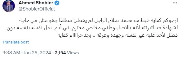 كتب شوبير عبر حسابه الرسمي على موقع X: أرجوكم كفاية خبط في محمد صلاح، الراجل لم يخطئ مطلقًا وهو مش في حاجة لشهادة حد لتبرئته.