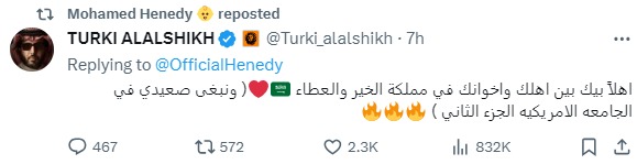 وكتب تركي آل الشيخ عبر حسابه الشخصي بموقع التدوينات القصيرة X: أهلًا بيك بين أهلك وإخوانك في مملكة الخير والعطاء، ونبغي صعيدي في الجامعة الأمريكية الجزء الثاني.