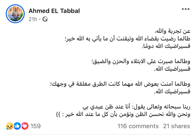 وكتب أحمد في آخر كلماته على فيس بوك قائلا: عن تجربة والله، طالما رضيت بقضاء الله وتيقنت أن ما يأتي به الله خير، فسيراضيك الله دومًا، وطالما صبرت على الابتلاء والحزن والضيق، فسيراضيك الله، وطالما آمنت بعوض الله مهما كانت الطرق مغلقة في وجهك، فسيراضيك الله ربنا سبحانه وتعالى يقول: أنا عند ظن عبدي بي ونحن والله نحسن الظن ونؤمن بأن كل ما عند الله خير.