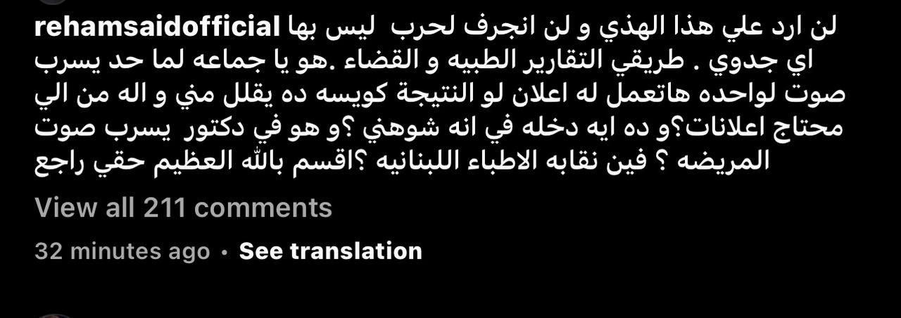 وقالت الإعلامية ريهام سعيد فى منشور عبر إنستجرام: لن أرد على هذا الهذي، ولن أنجرف لحرب ليس بها أي جدوي، طريقي هو التقارير الطبية والقضاء.