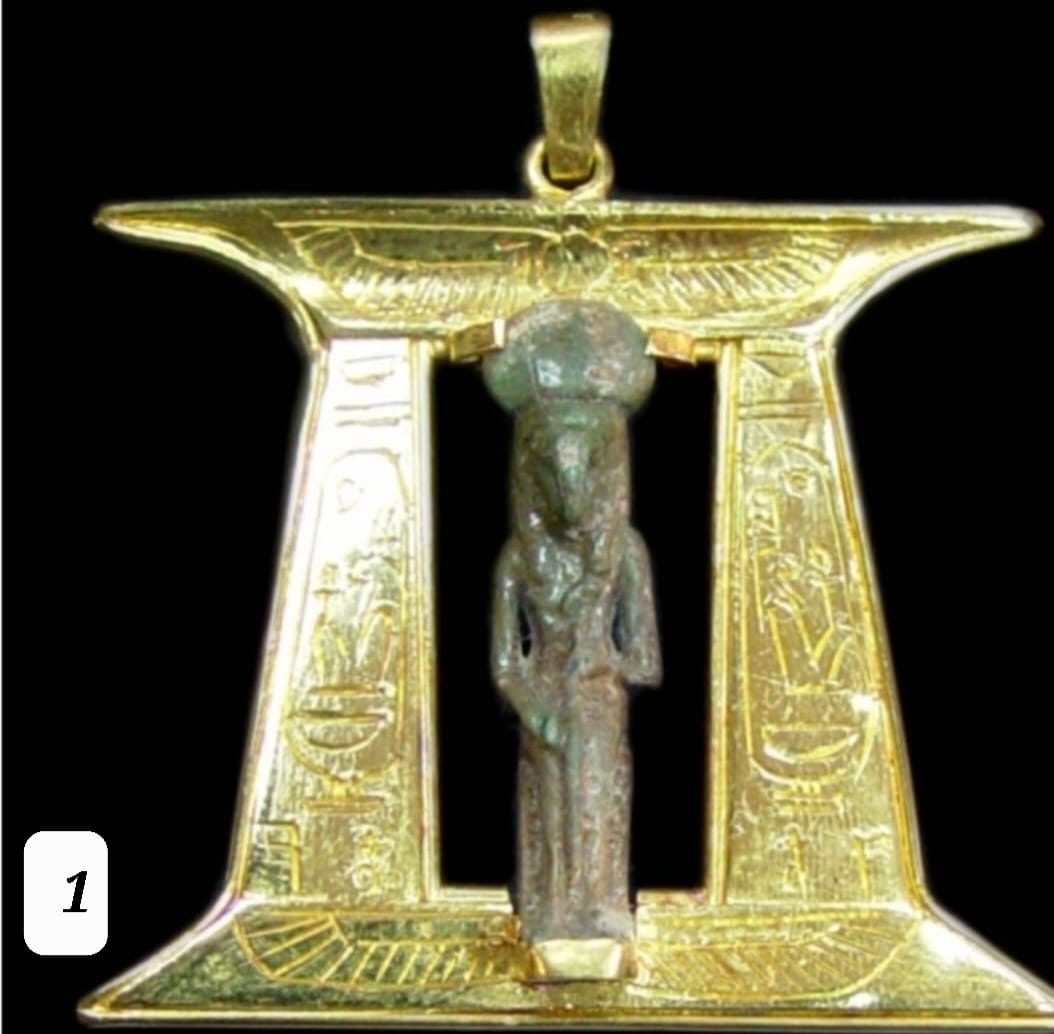 - تعليقه من الذهب، على شكل معبد فرعوني وعلى باب المعبد من أعلى نسر ناشر جناحيه ومركب وسطها تمثال فرعوني أثري من الحجر ويجلس على كرسي حجري.