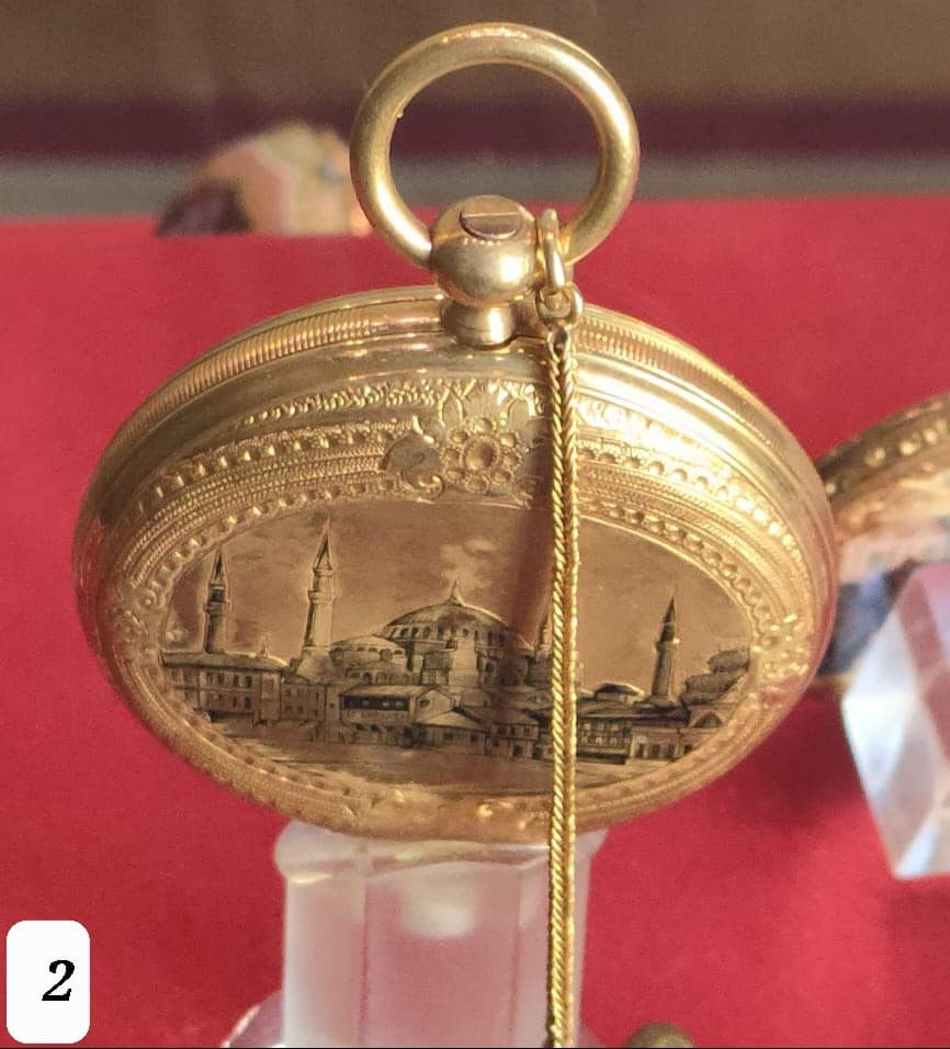 - ساعة جيب من الذهب، لها فتحه للتعليق مركب بها سلسلة صغيرة ومع الساعة مفتاح للملو من النحاس.