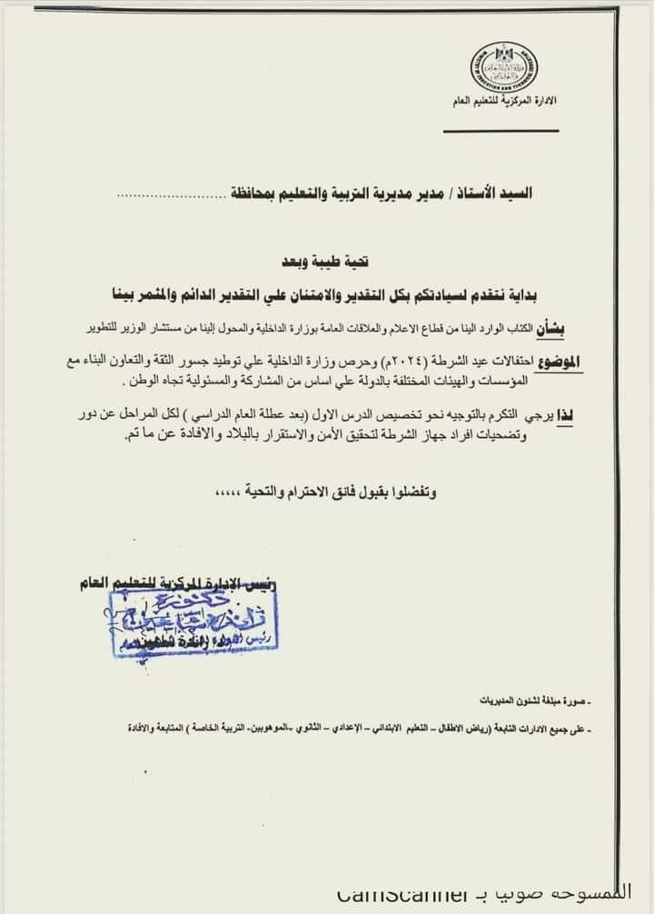 وأضافت وزارة التربية والتعليم، في الخطاب الموجه للمديريات أن ذلك في إطار احتفالات عيد الشرطة 2024 وحرص وزارة الداخلية على توطيد جسور الثقة والتعاون البناء مع المؤسسات والهيئات المختلفة بالدولة على أساس من المشاركة والمسئولية تجاه الوطن.