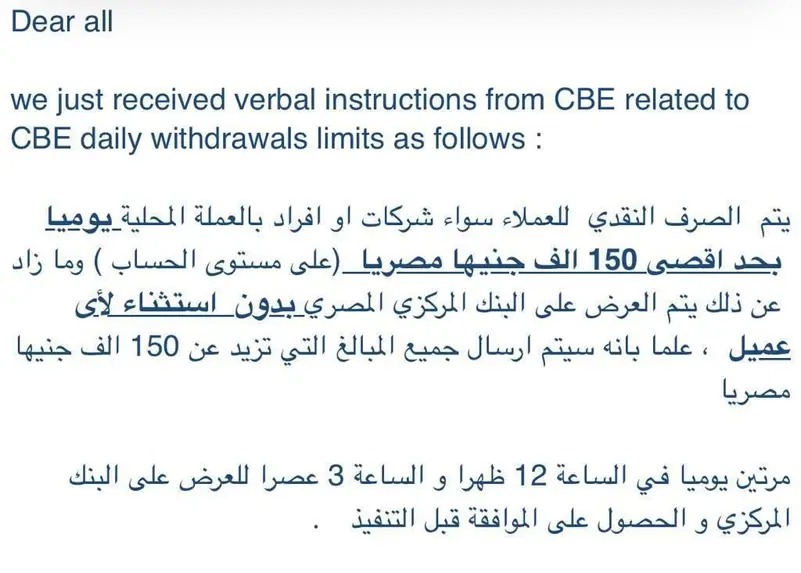 وقال البنك إن الحد الأقصى ينطبق على السحب النقدي أو عبر الشيكات مع عدم وجود أي استثناء لسحب أكثر من 150 ألف جنيه، من جميع حسابات العميل سواء نقدا أو بشيكات، مع إلغاء جميع الاستثناءات السابق منحها لأي جهة كانت وفي حالة إصرار العميل على صرف الشيك نقدا أو رفض الشيك يتم رفض الشيك بعبارة عدم الالتزام بتعليمات البنك المركزي.