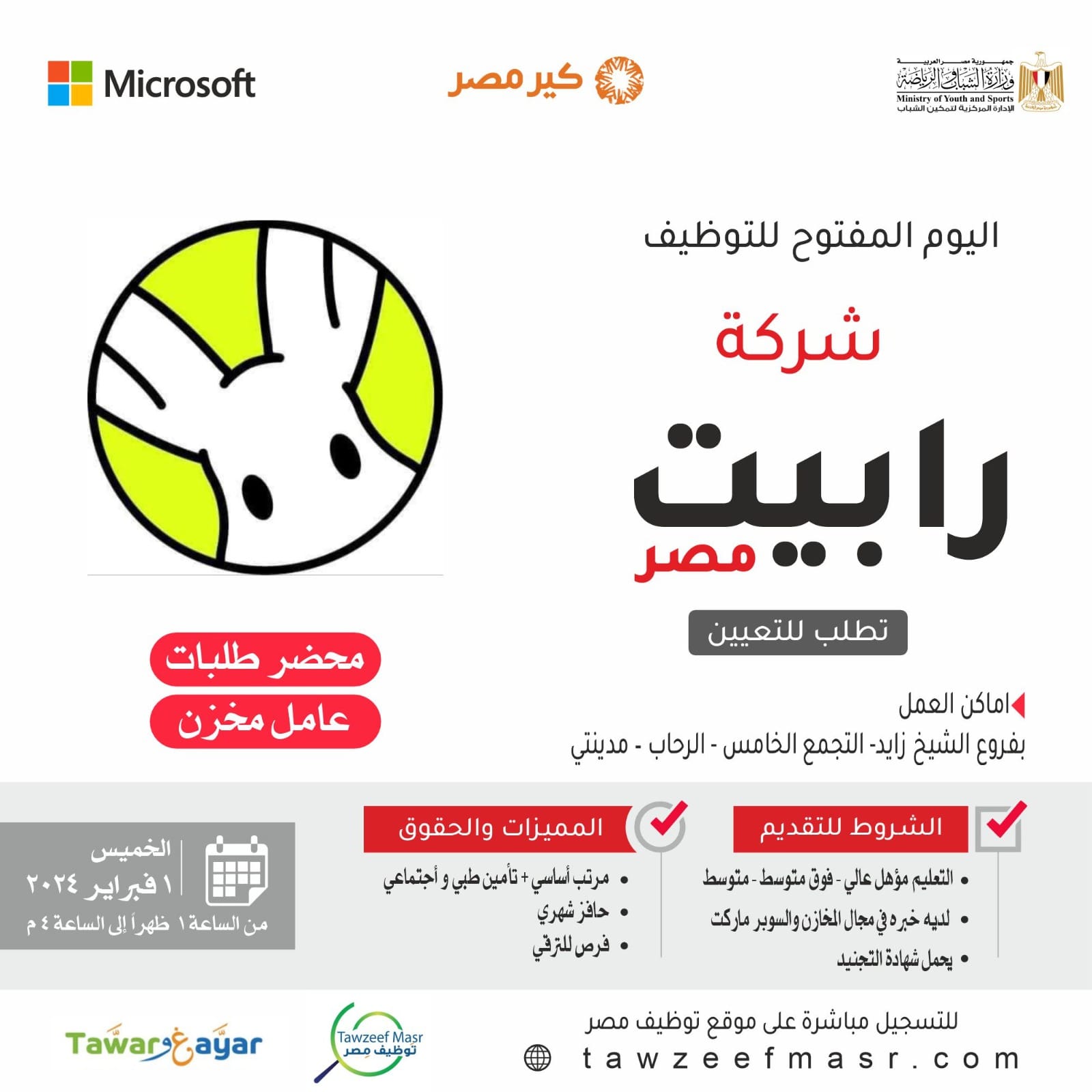 وينطلق يوم التوظيف من مقر إطلاق المبادرة في مقر شركة رابيت مارت لتوصيل الطلبات، في ميدان المحطة بالقرب من مترو المعادي، من الساعة 1 ظهرا الى 4 مساء، للتقديم في وظائف محضر طلبات ( Order picker)، وعامل مخزن لتوصيل طلبات لمدن الشيخ زايد والتجمع الخامس والرحاب ومدينتي.