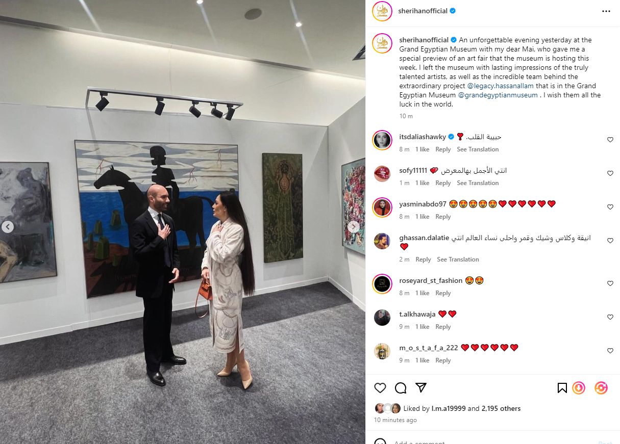 ونشرت شريهان عبر حسابها الشخصي على موقع تبادل الصور والفيديوهات انستجرام، صور من هذه الزيارة، وكتبت: أمسية لا تنسى في المتحف المصري الكبير مع عزيزتي مي، التي قدمت لي معاينة خاصة للمعرض الفني الذي يستضيفه المتحف هذا الأسبوع. لقد غادرت المتحف مع انطباعات لا تُنسى عن الفنانين الموهوبين حقًا، بالإضافة إلى الفريق المذهل الذي يقف وراء المشروع الاستثنائي الموجود في المتحف المصري الكبير أتمنى لهم كل التوفيق في العالم.