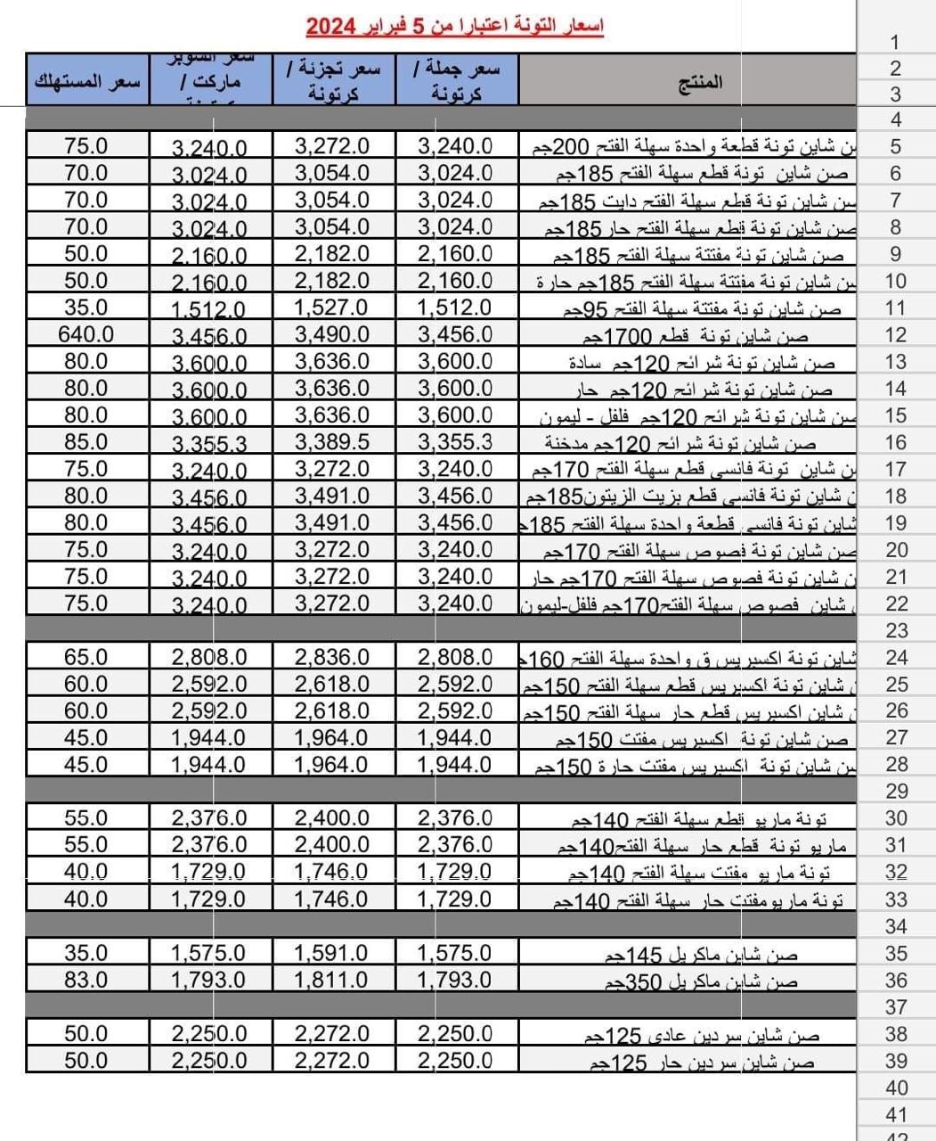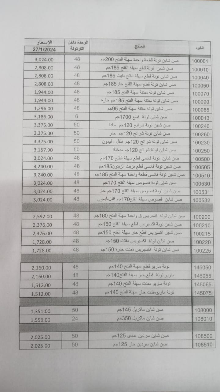 وحسب قائمة الأسعار الجديدة، التي حصل القاهرة 24 على نسخة منها، وصل سعر تونة صن شاين قطع سهلة الفتح وزن 185 جراما إلى 70 جنيها عادية أو دايت أو حار، وارتفع سعر تونة مفتتة سهلة الفتح وزن 185 جراما إلى 50 جنيها.
