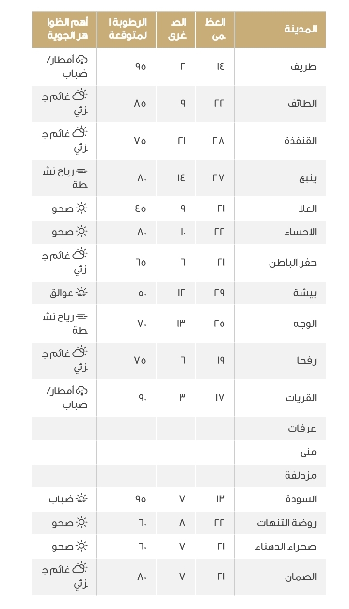 ومن المتوقع أن يستمر طقس السعودية اليوم عند درجات الحرارة المنخفضة، وتنشط الرياح السطحية شمالية إلى شمالية غربية بسرعة 20-40 كم/ساعة على البحر الأحمر، ويبلغ ارتفاع الموج من متر إلى مترين حيث يكون البحر متوسط الموج.