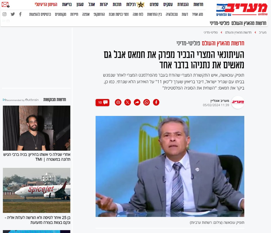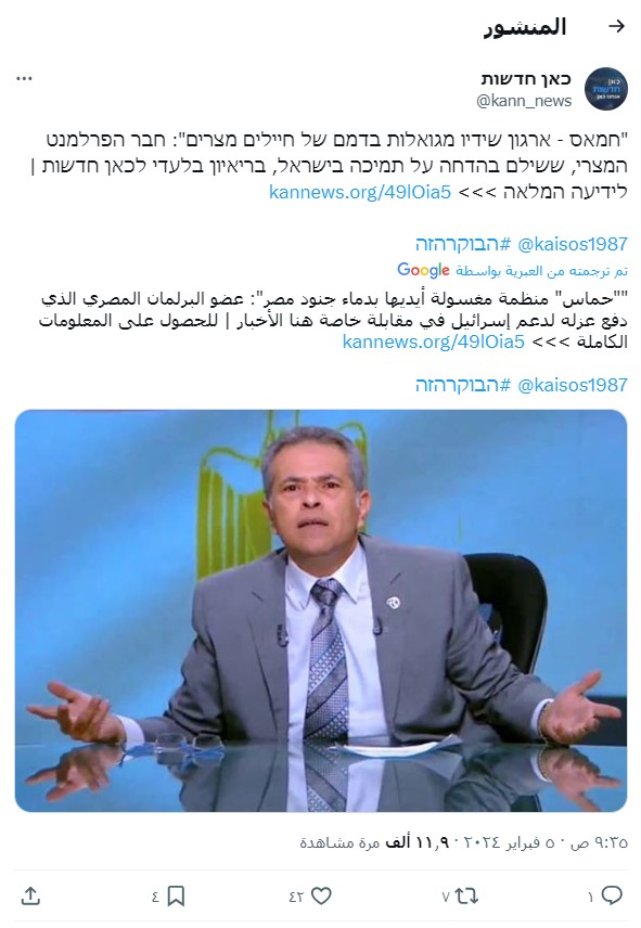 وتابع البرلماني السابق توفيق عكاشة في تصريحاته الاستفزازية المتزامنة مع استمرار الحرب الإسرائيلية الغاشمة على قطاع غزة والتي أودت بحياة أكثر من 27 ألف شهيد غالبيتهم من النساء والأطفال؛ مع قناة كان 11 العبرية، بأن حركة حماس تاجرت بالقضية الفلسطينية وحولت مصر إلى أرض عازلة، مواصلا مزاعمه قائلا: "هي منظمة تاجرت بالقضية الفلسطينية.. منظمة حولت مصر إلى أرض عازلة وافتتت أيديها بدماء مصر.. لن أنساها".