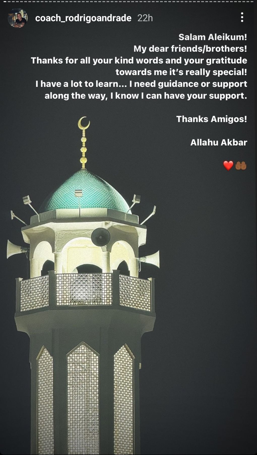 أعلن البرازيلي ماركو رودريجو، مدرب أحمال نادي الزمالك السابق، اعتناقه الإسلام، وذلك عبر حسابه الرسمي على موقع إنستجرام.