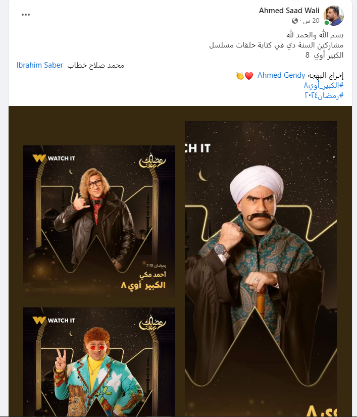 علق المؤلف أحمد سعد والي، أحد مؤلفي مسلسل الكبير أوي الجزء 8 بطولة الفنان أحمد مكي، والمقرر عرضه في السباق الرمضاني المقبل 2024، على عدم كتابة اسم مؤلفين العمل في البرومو التشويقي، والاكتفاء بكتابة المخرج أحمد الجندي كمشرف عام على الكتابة.