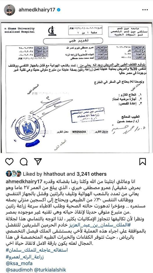 واختتم أحمد خيري: مؤخرا تدهورت حالته الصحية وطلب الأطباء سرعة زراعة رئتين من متبرع متوفى حديثا، لإنقاذ حياته، وهي تقنيه غير موجوده بمصر، ونظرا لأن تكاليفها تتجاوز الإمكانيات بكثير، لذا أتوجه بالتماسي هذا الجلالة الملك سلمان بن عبد العزيز خادم الحرمين الشريفين للتفضل بالموافقة على إجراء هذه العملية لأخي بمستشفى الملك فيصل التخصصي بالرياض، حيث تتوفر الكفاءات والخبرات الطبية المتخصصة في هذا المجال لعله يكون بارقة الامل لإنقاذ حياة أخي.