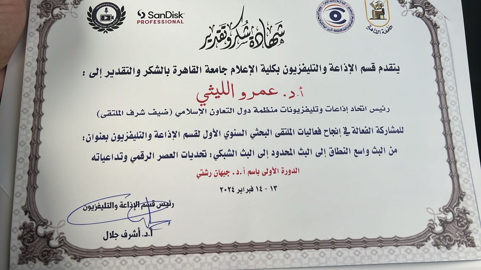 تكريم عمرو الليثي في الملتقى الإعلامي لكلية الإعلام بجامعة القاهرة