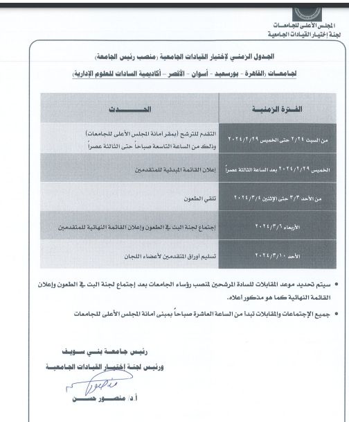 وجاء الجدول الزمني للتقدم لمنصب رئيس الجامعة/ الأكاديمية كالآتي: