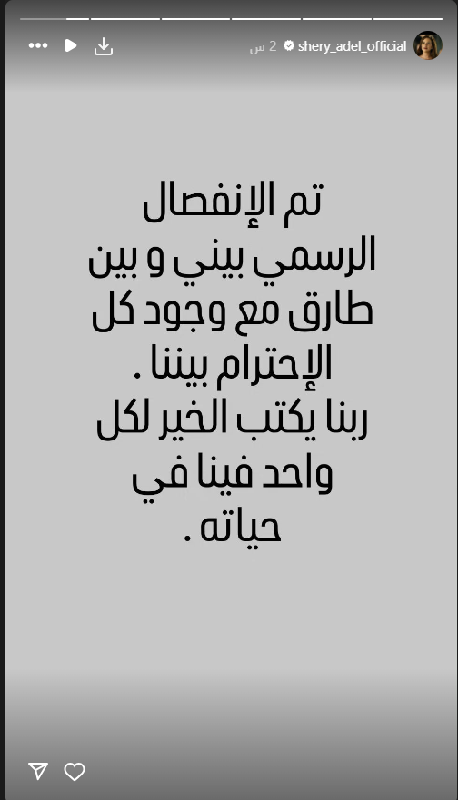 وكتبت شيري عادل عبر خاصية ستوري لحسابها على انستجرام، الآتي: تم الانفصال الرسمي بيني وبين طارق مع وجود كل الاحترام بيننا.. ربنا يكتب الخير لكل واحد فينا في حياته.