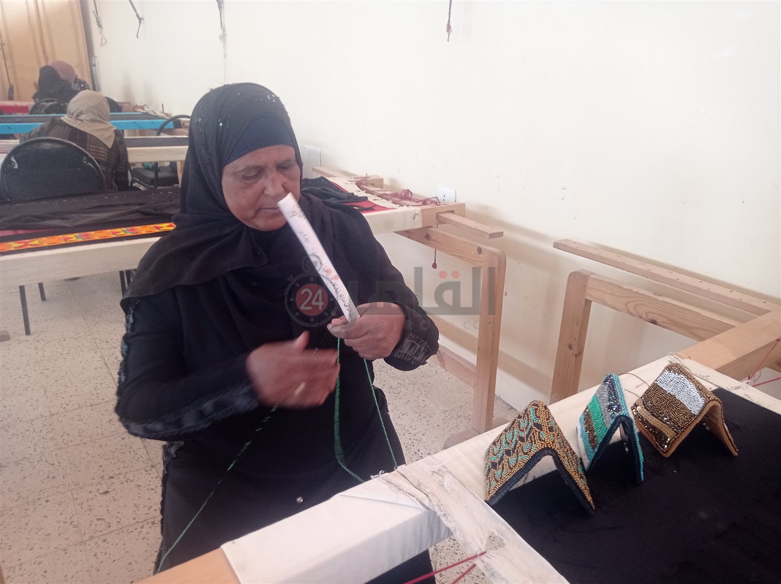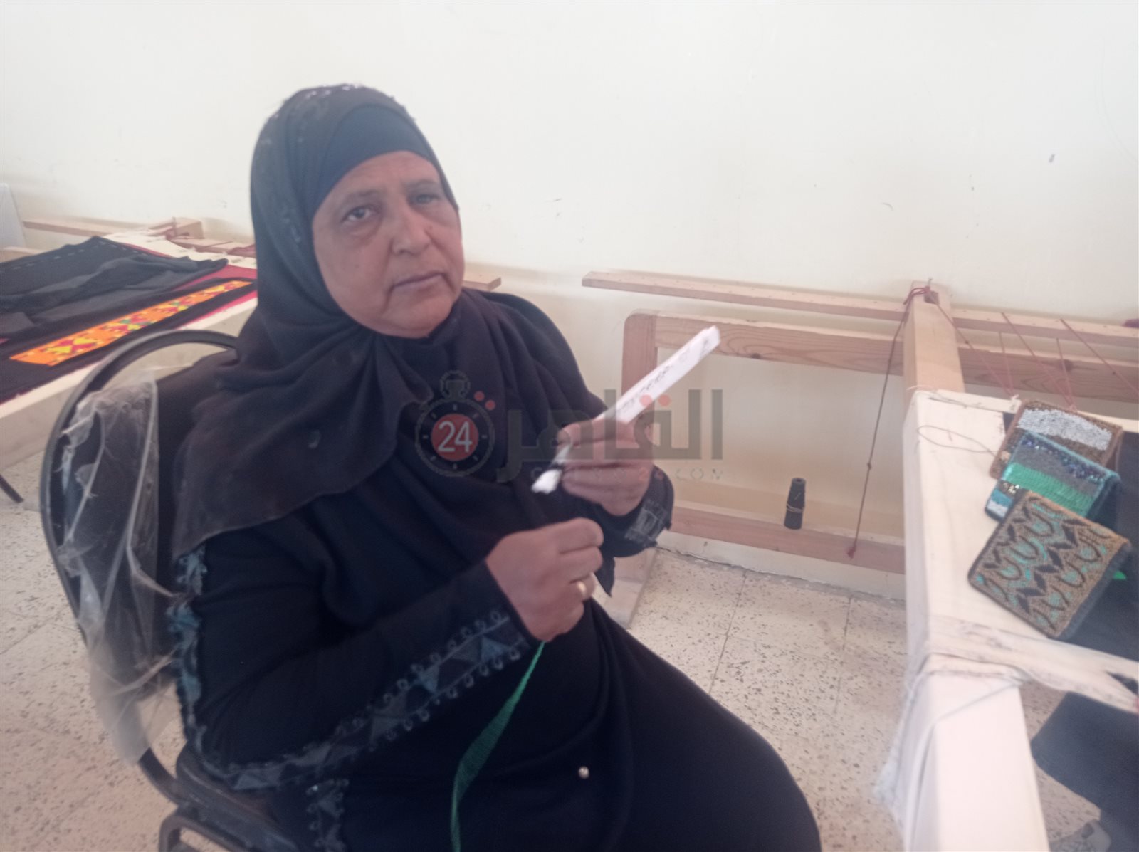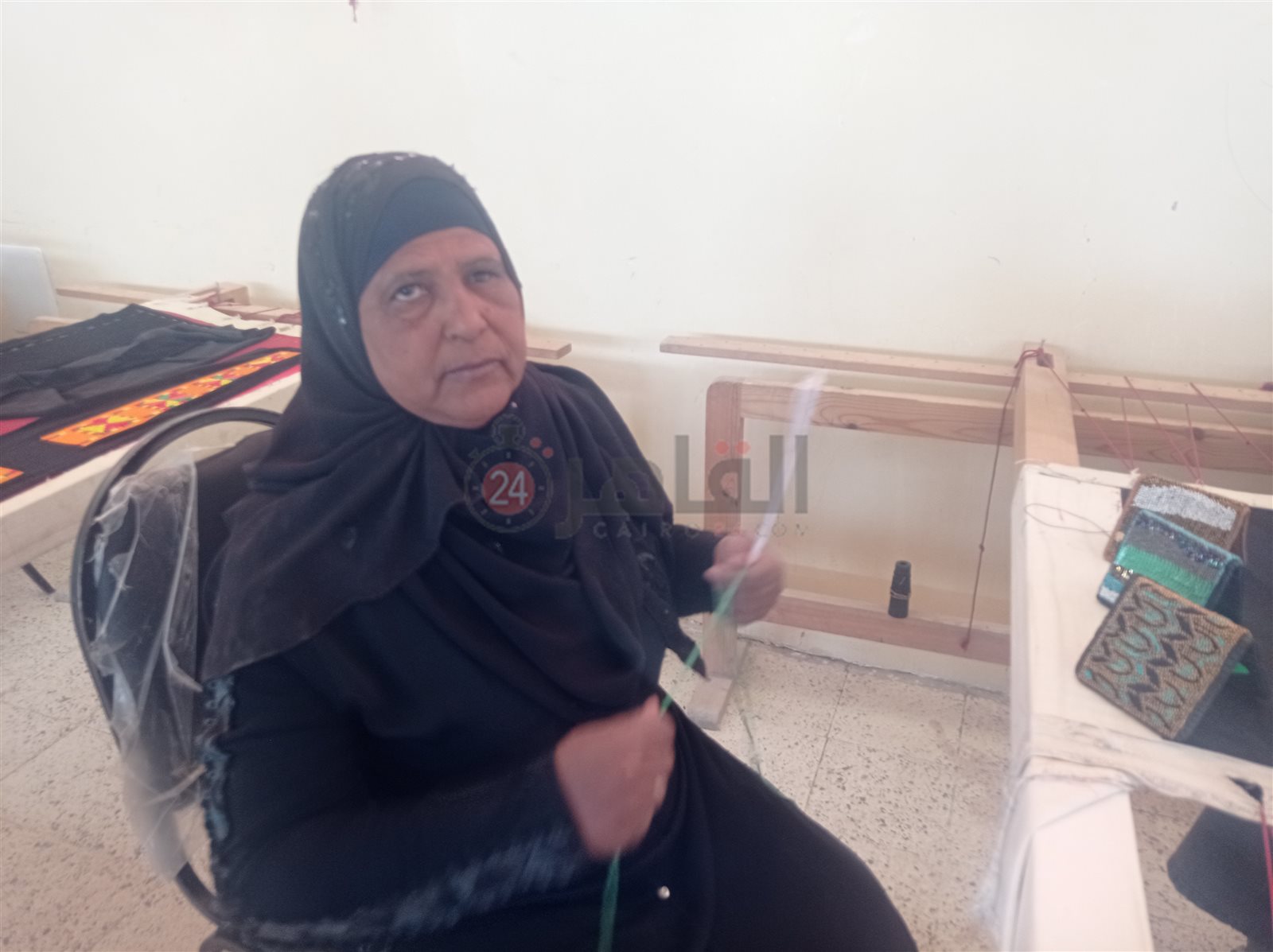 بوجه بشوش وابتسامة رضا لا تفارقها وعزيمة قوية، متحدية إعاقتها البصرية بعدما فقدت إحدى عينيها تجلس أمام النول الفرنسي بإحدى الورشة بمنطقة المعنا بمدينة قنا، لتعمل وسط عشرات الفتيات والسيدات في نسج المنتجات اليدوية بدقة وسرعة، لمساعدة زوجها الكفيف على مصاعب الحياة والإنفاق على أبنائهما الأربعة.