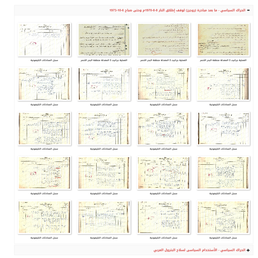 وتتناول الوثائق في تلك المرحلة "الحراك السياسي - ما بعد مبادرة (روجرز) لوقف إطلاق النار 8-8-1970م وحتى صباح 6-10-1973 الحراك السياسي - الاستخدام السياسي لسلاح البترول العربي".