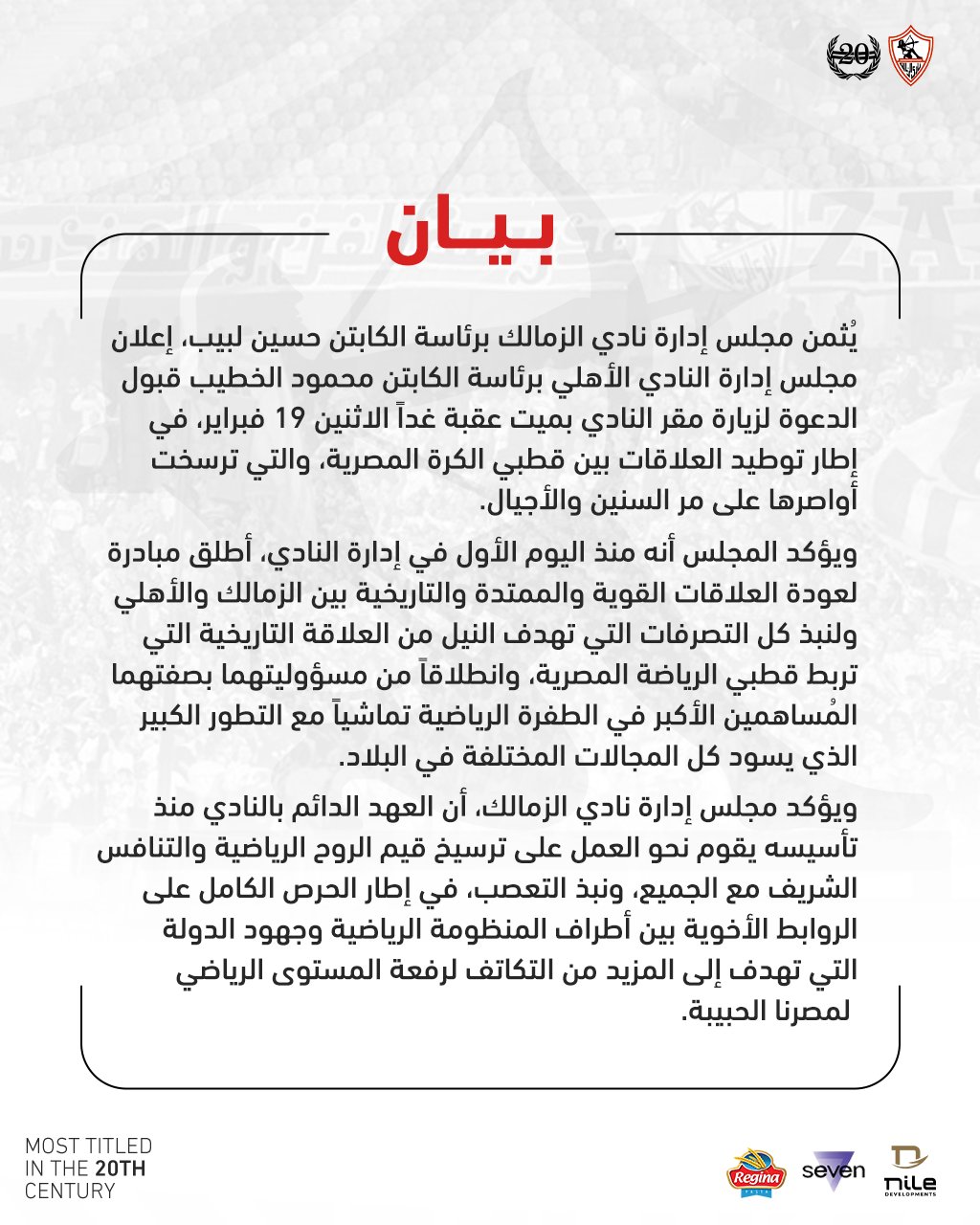وأفاد البيان: "يُثمن مجلس إدارة نادي الزمالك برئاسة الكابتن حسين لبيب، إعلان مجلس إدارة النادي الأهلي برئاسة الكابتن محمود الخطيب قبول الدعوة لزيارة مقر النادي بميت عقبة غدًا الاثنين 19 فبراير، في إطار توطيد العلاقات بين قطبي الكرة المصرية، والتي ترسخت أواصرها على مر السنين والأجيال.