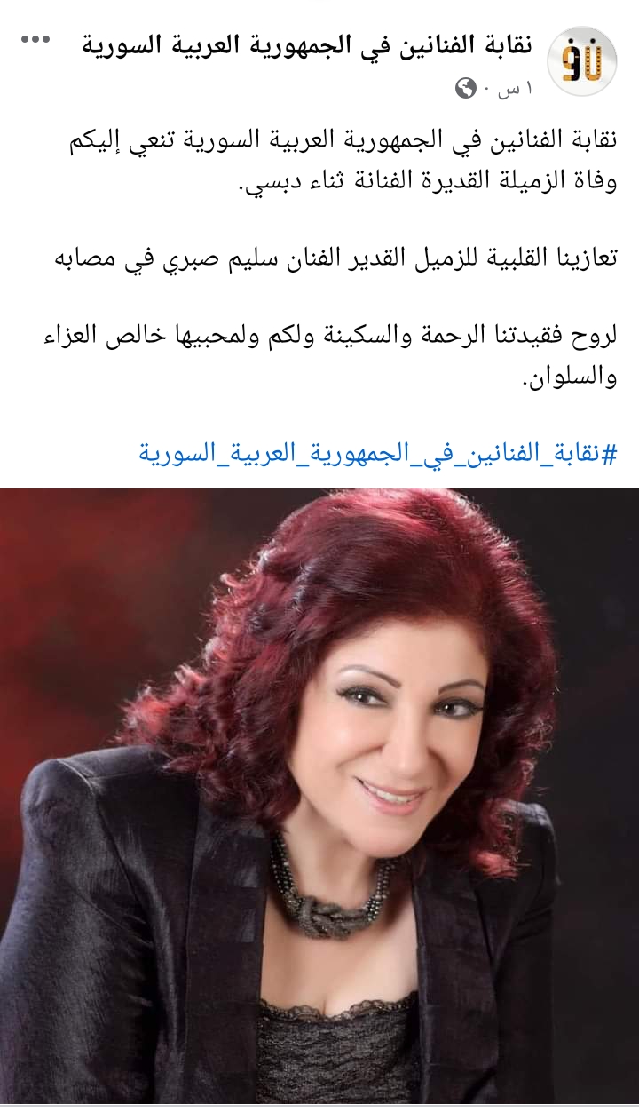 ونشرت نقابة الفنانين في جمهورية العربية السورية، صورة ثناء دبسي، عبر حسابهم الشخصي بموقع فيسبوك، وعلقت عليه قائلة: نقابة الفنانين في الجمهورية العربية السورية تنعي إليكم وفاة الزميلة القديرة الفنانة ثناء دبسي.