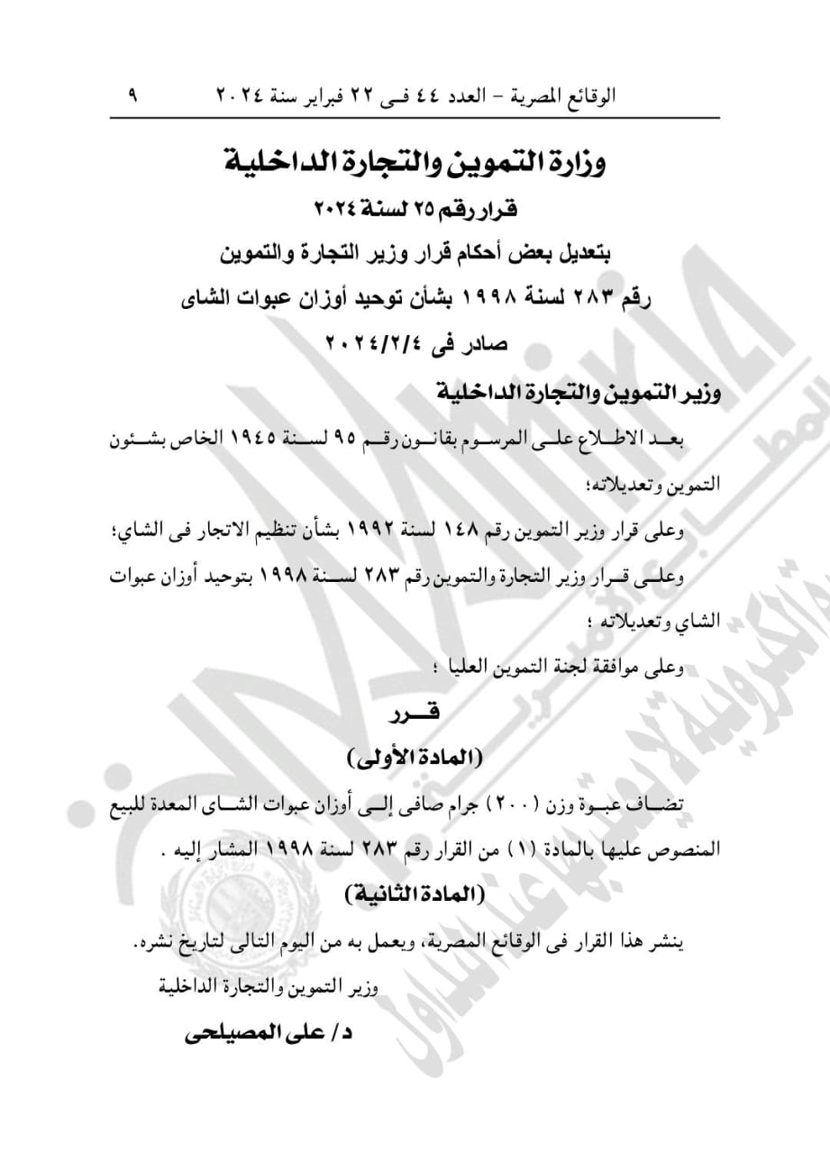 ووفق ما نقلته جريدة الوقائع، جاء نص القرار كالتالي: بعد الاطلاع على المرسوم بقانون رقم 95 لسنة 1945 الخاص بشئون التموين وتعديلاته، وعلى قرار وزير التموين رقم 148 لسنة 1992 بشأن تنظيم الاتجار في الشاي؛ وعلى قرار وزير التجارة والتموين رقم 283 لسنة 1998 بتوحيد أوزان عبوات الشاي وتعديلاته؛ وعلى موافقة لجنة التموين العليا.