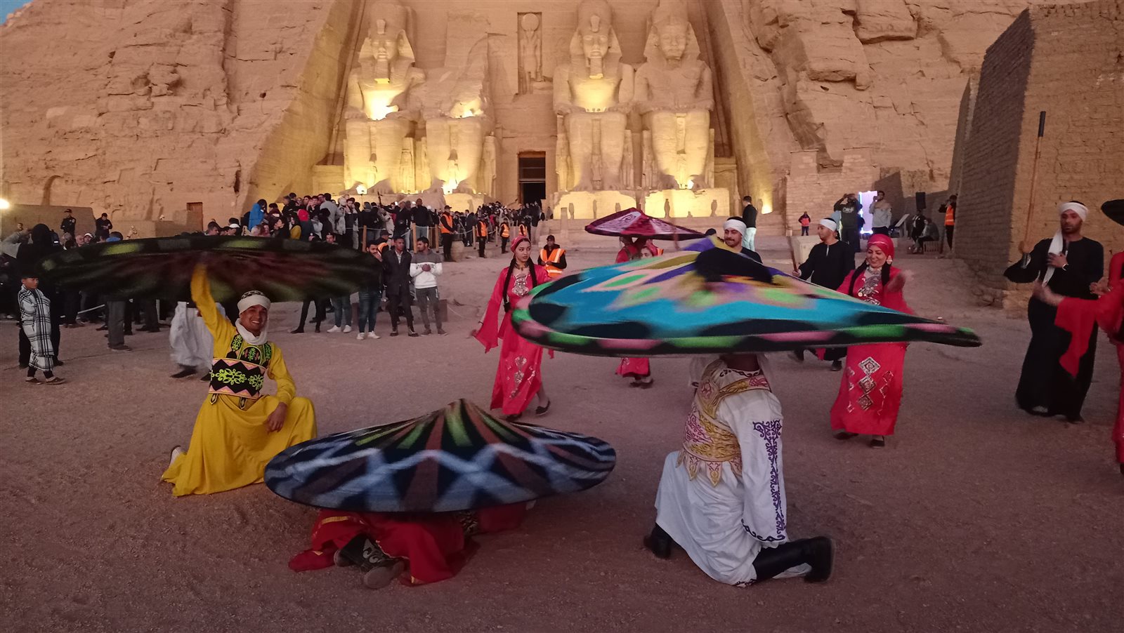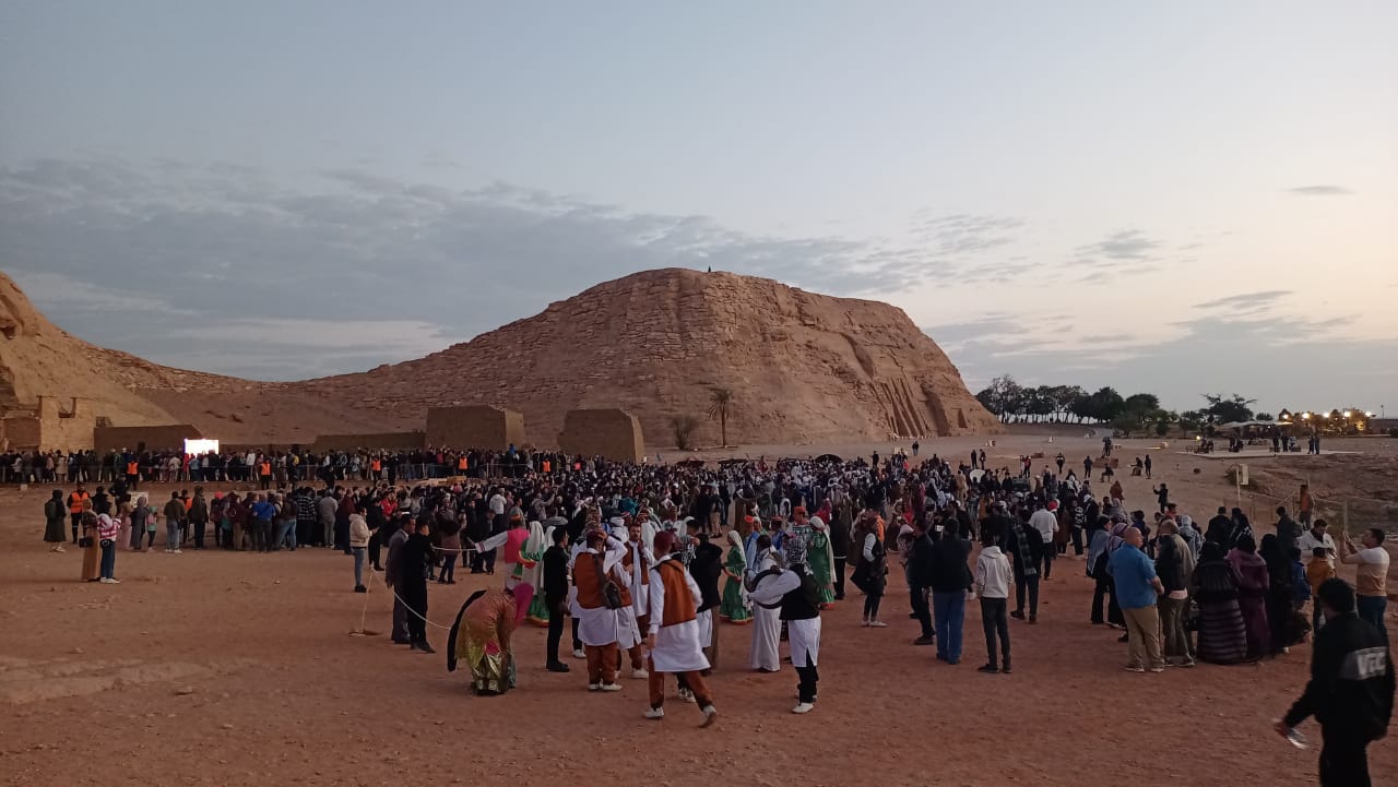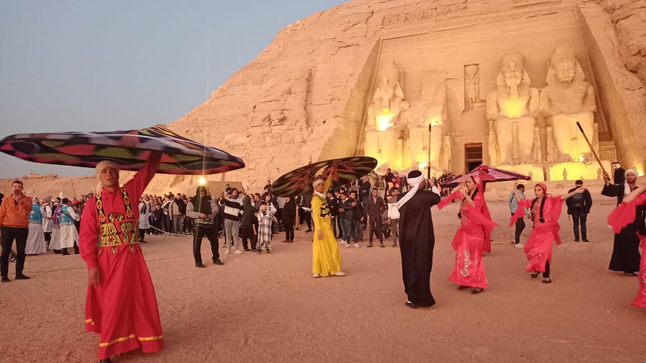 فرق مهرجان أسوان تحتفل بتعامد الشمس بمعبد أبو سمبل| صور