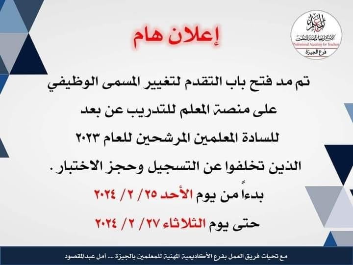 أكاديمية المعلمين تعلن مد فتح باب التقدم لتغيير المسمى الوظيفي
