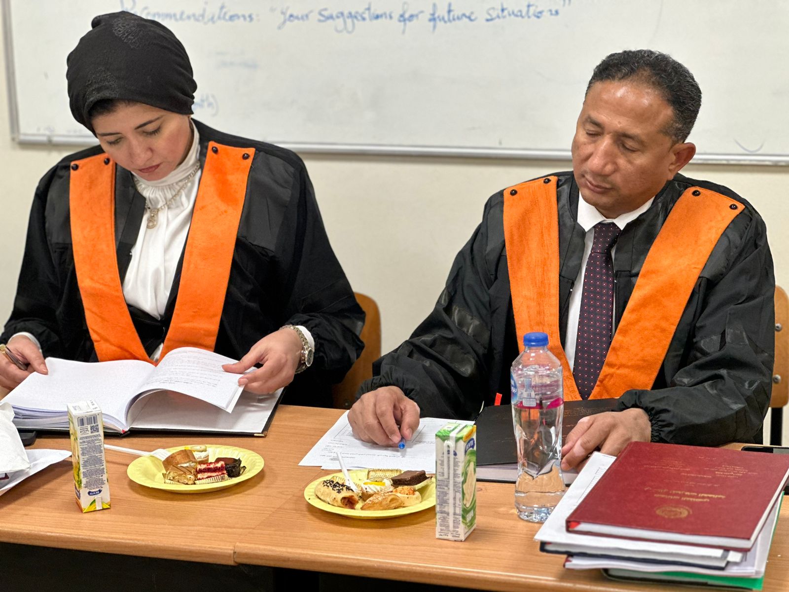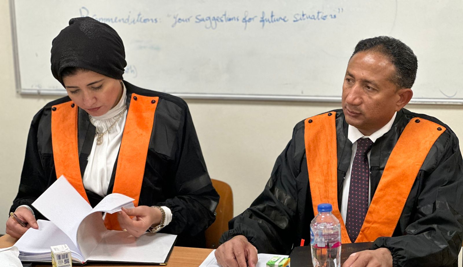 وضمت هيئة المناقشة كلا من المستشار الدكتور عبد الناصر عثمان نائب رئيس هيئة قضايا الدولة، والأستاذ الزائر في الأكاديمية العربية للعلوم والتكنولوجيا والنقل البحري، بالإضافة إلى الدكتورة غادة حلمي أحمد مدير تحرير دورية دراسات حقوق الإنسان ومنصة حقوق الإنسان بالهيئة العامة للاستعلامات، والأستاذ الزائر في الأكاديمية العربية للعلوم والتكنولوجيا والنقل البحري.
