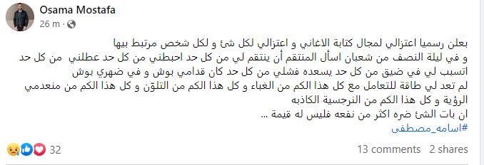 وكتب أسامة مصطفى، عبر حسابه الشخصي بموقع فيسبوك: بعلن رسميًا اعتزالي لمجال كتابة الأغاني واعتزالي لكل شيء ولكل شخص مرتبط بيها.