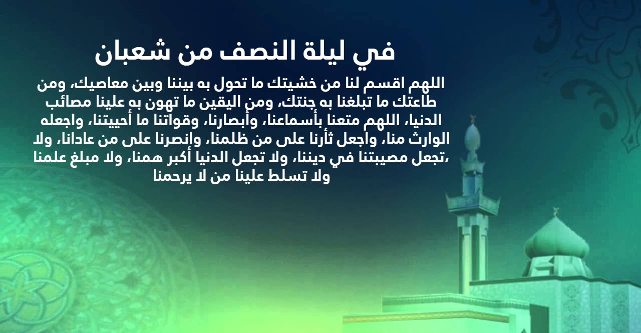 - اللهم اجعل ليلة النصف من شعبان ليلة تتبدل فيها ذنوبنا إلى حسنات، وهمومنا إلى أفراح وأحلامنا إلى واقع، اللهم اجعلها ليلة ساعدة للقلوب ساترة غافرة للذنوب مفرجة للكروب.