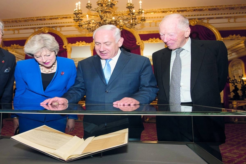 فيما أشار جاكوب روتشيلد في حديث سابق مع السفير الإسرائيلي، إلى وعد بلفور وتوطين اليهود في فسطين، وذكر أن إعلان دعم وطن لليهود في فلسطين خضع لخمس مسودات قبل أن يصوغ أخيرا في نوفمبر 1917.