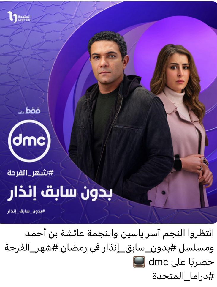 سيتم عرض مسلسل بدون سابق إنذار بطولة آسر ياسين وعائشة بن أحمد، على قناة DMC، حيث أعلنت القناة أنها ستقدم العمل حصريًا طوال شهر رمضان.