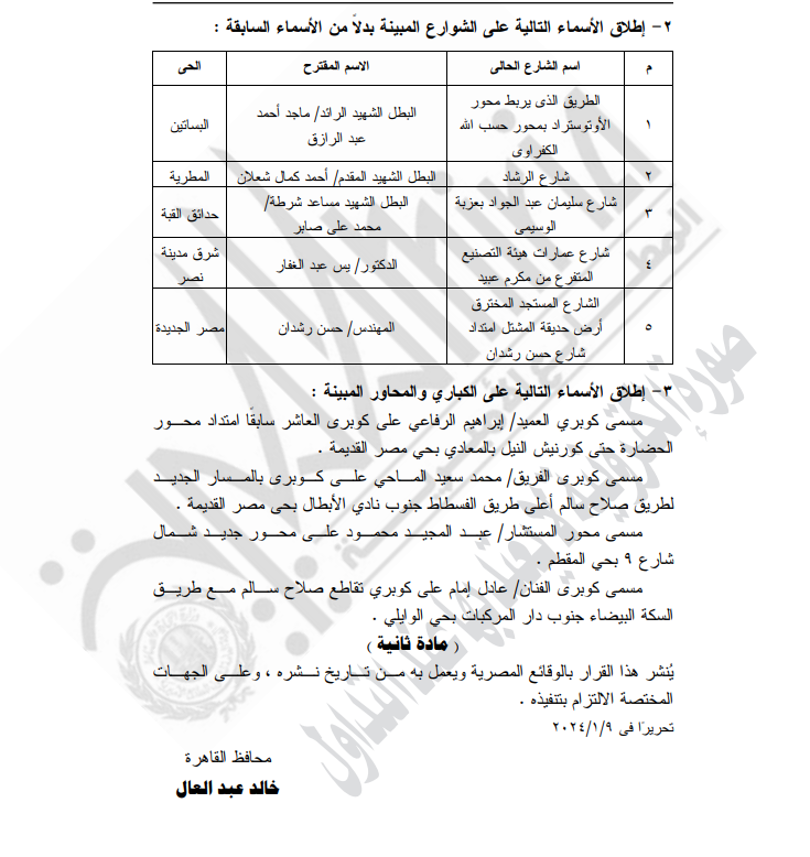 نشرت الجريدة الرسمية اليوم، قرار محافظ القاهرة اللواء خالد عبدالعال، بإطلاق الأسماء التالية على الكباري والمحاور والتي جاء أبرزها اسم الفنان عادل إمام.
