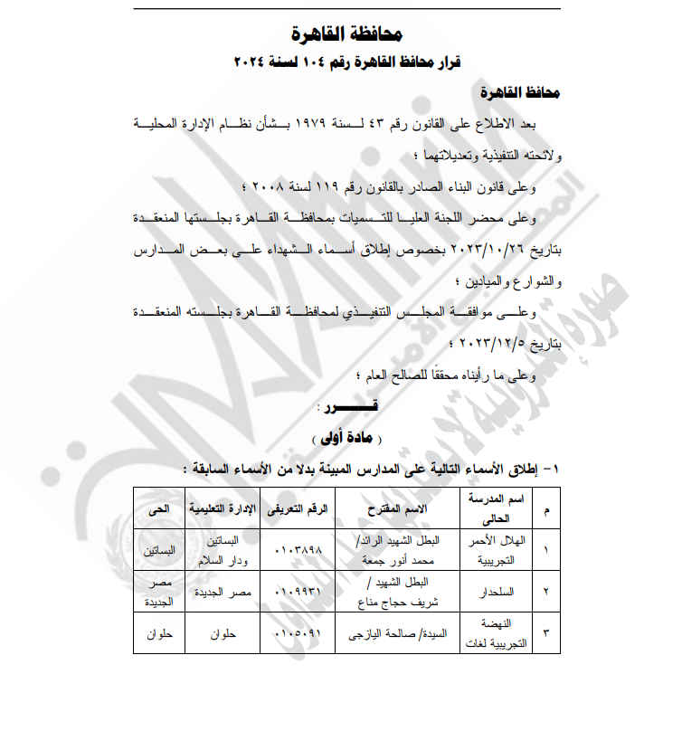 كما وافق المجلس على إطلاق اسم البطل الشهيد رائد شرطة محمد أنور جمعة عبد الكريم على مدرسة الهلال الأحمر التجريبية لغات بإدارة البساتين التعليمية، والبطل الشهيد مقدم شرطة أحمد كمال شعلان على شارع الرشاد بحي المطرية، والبطل الشهيد ماجد أحمد عبد الرازق على الطريق الذي يربط محور الأوتوستراد بمحور حسب الله الكفراوي بالبساتين