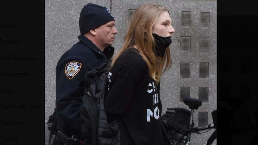 وكانت هانتر شيفر ترتدي قميصًا كتب عليه أوقفوا إطلاق النار الآن، بينما كانت ترافقها ضابطة في شرطة نيويورك ويداها مقيدتان خلف ظهرها.