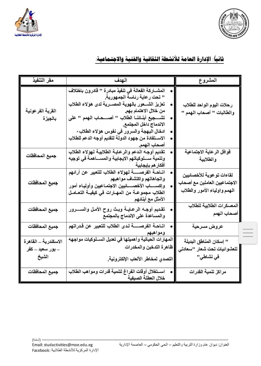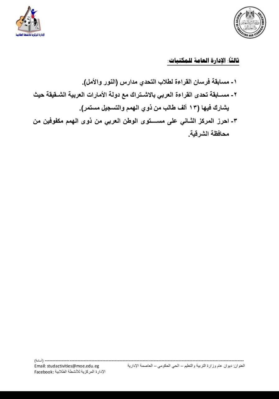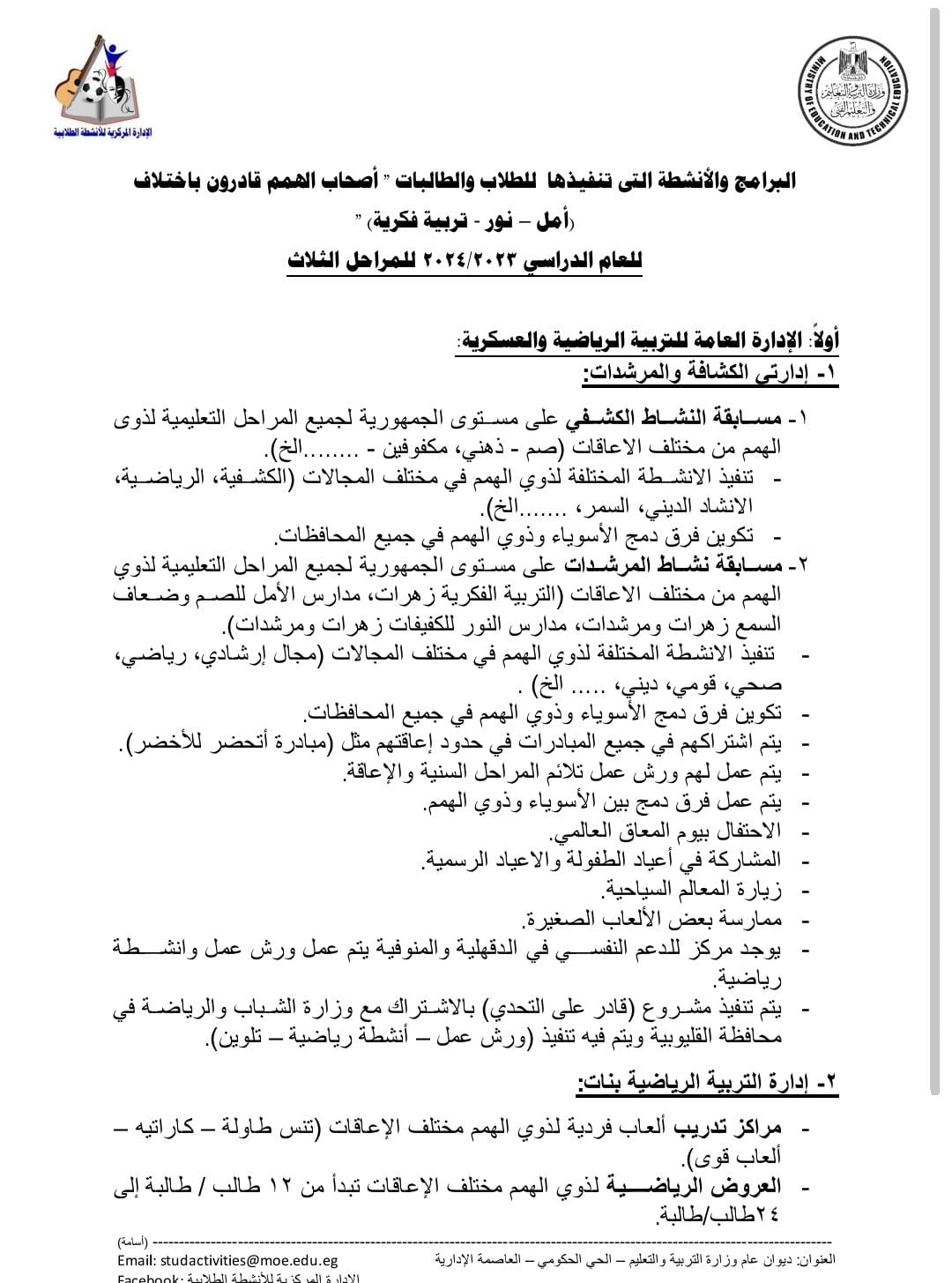 1- مسابقة النشاط الكشفي على مستوى الجمهورية لجميع المراحل التعليمية لذوى الهمم من مختلف الاعاقات (صم - ذهني، مكفوفين).