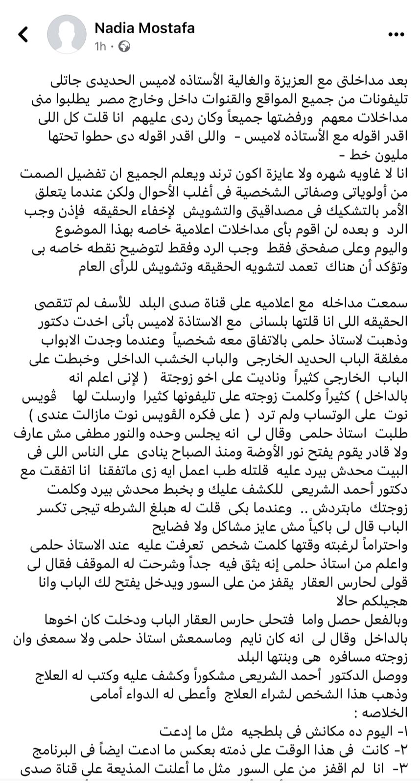 وأضافت: اليوم وعلى صفحتي فقط وجب الرد وفقط لتوضيح نقطة خاصة بي، وتؤكد أن هناك تعمدا لتشويه الحقيقة وتشويش للرأي العام، سمعت مداخلة مع إعلامية على قناة ما للأسف لم تتقصَ الحقيقة اللي أنا قلتها بلساني مع الأستاذة لميس بأني أخدت دكتور وذهبت لأستاذ حلمي بالاتفاق معه شخصيًا، وعندما وجدت الأبواب مغلقة الباب الحديد الخارجي والباب الخشب الداخلي وخبطت على الباب الخارجي كثيرًا وناديت على أخو زوجته، لإني أعلم أنه بالداخل، كثيرًا وكلمت زوجته على تليفونها كثيرًا وأرسلت لها ڤويس نوت على الوتساب ولم ترد، وعلى فكره الڤويس نوت ما زال عندي.