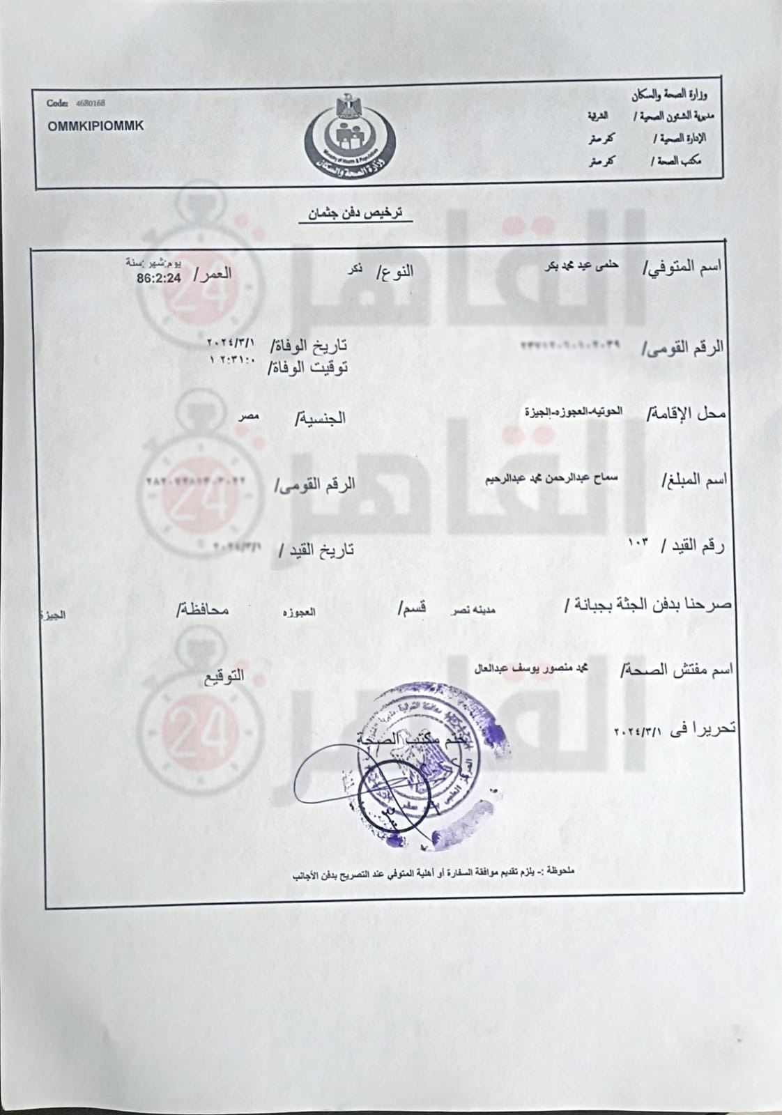 لا شبهة جنائية.. ننشر شهادة الوفاة وتصريح الدفن لحلمي بكر | خاص