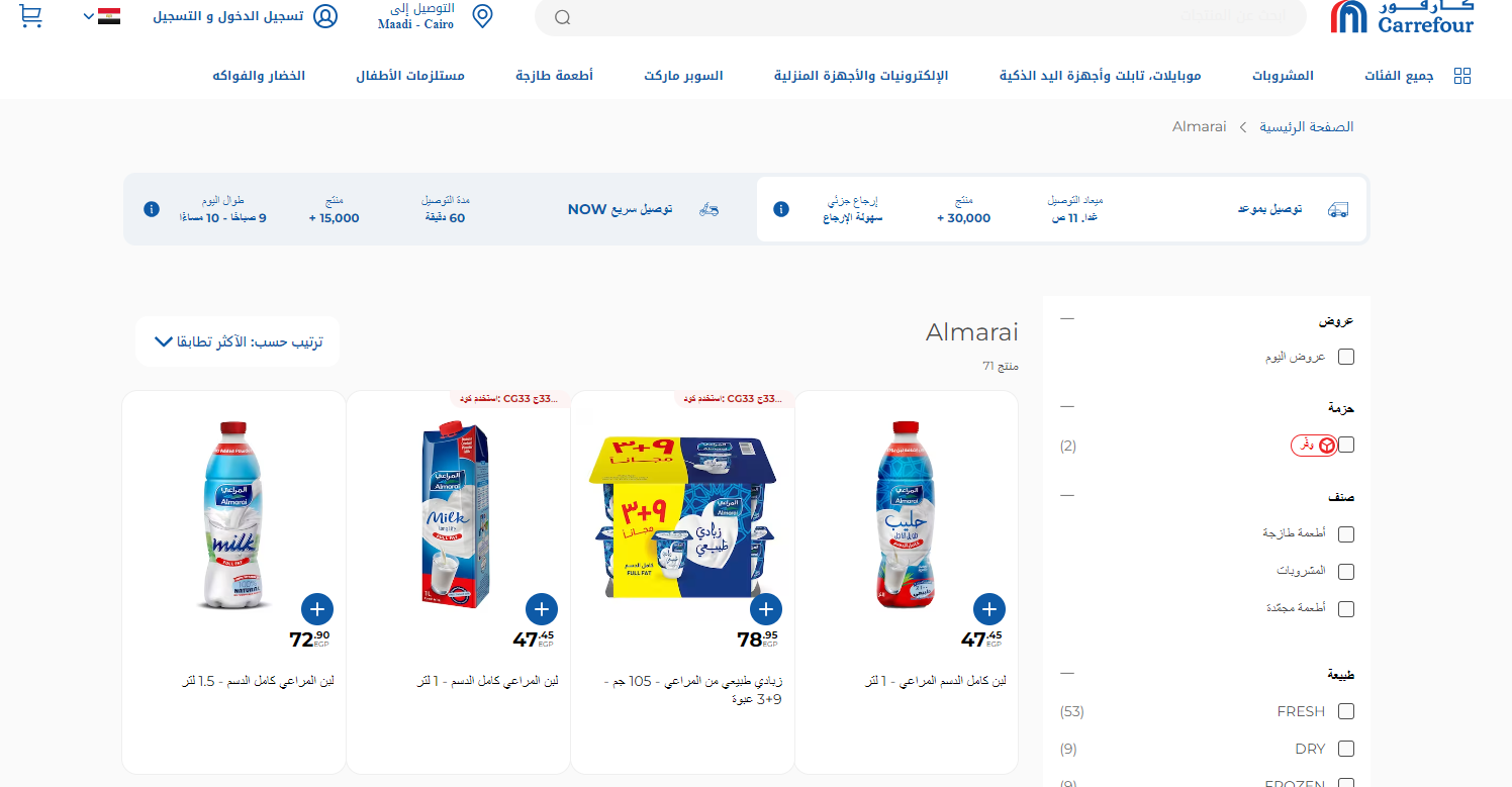 وفي سلاسل كارفور ارتفع سعر لتر لبن المراعي سعة لتر ليصل إلى 48 جنيها، بينما بلغ سعر 1.5 لتر من لبن المراعي 73 جنيها.