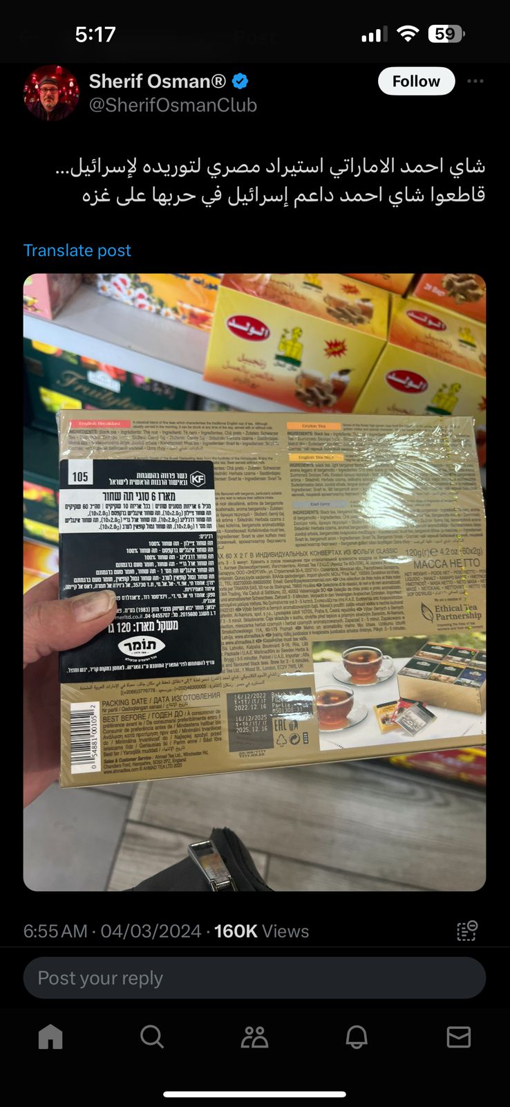 وتداول عدد كبير من مستخدمي وسائل التواصل الاجتماعي صورا تظهر وجود منتجات لشركة أحمد تي لصناعة الشاي، لدى كيان الاحتلال الإسرائيلي وأيضا منتجات لشركة فاريو للصناعات الغذائية من الملوخية المجمدة والبازلاء والفاصوليا.