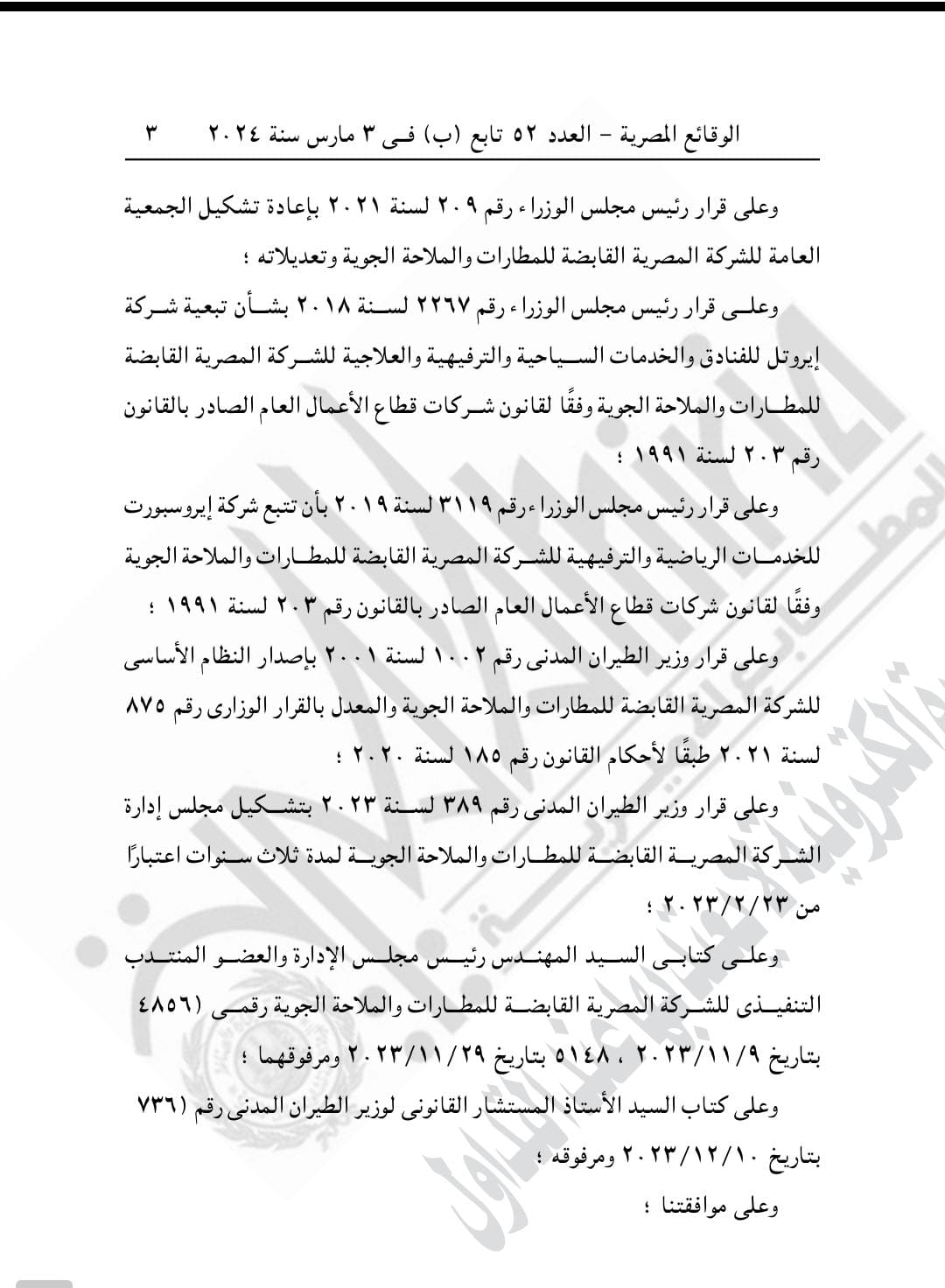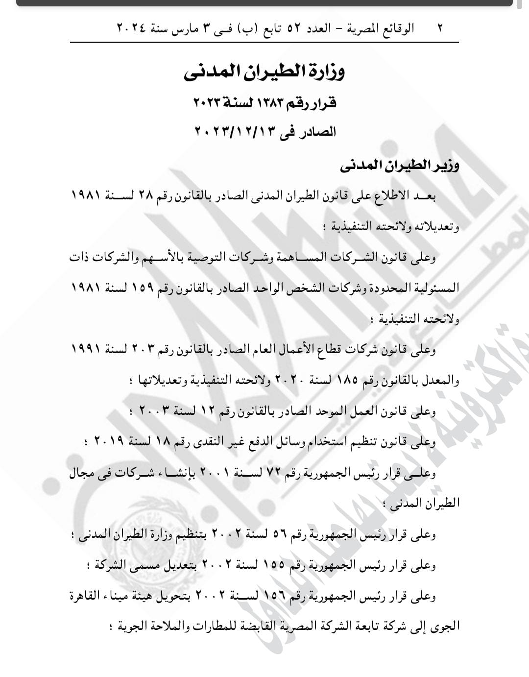 بعد الاطلاع على قانون الطيران المدني الصادر بالقانون رقم 28 لسنة 1981وتعديلاته ولائحته التنفيذية، وعلى قانون الشركات المساهمة وشركات التوصية بالأسهم والشركات ذات المسئولية المحدودة وشركات الشخص الواحد الصادر بالقانون رقم 159 لسنة1981، ولائحته التنفيذية ؛ وعلى قانون شركات قطاع الأعمال العام الصادر بالقانون رقم 203 لسنة 1991، والمعدل بالقانون رقم185 لسنة 2020 ولائحته التنفيذية وتعديلاتها ؛وعلى قانون العمل الموحد الصادر بالقانون رقم 12 لسنة 2003 ؛ وعلى قانون تنظيم استخدام وسائل الدفع غير النقدى رقم18 لسنة2019 ؛وعلى قرار رئيس الجمهورية رقم 72 لسنة 2001 بإنشاء شركات في مجال الطيران المدنى ؛ وعلى قرار رئيس الجمهورية رقم 56 لسنة2002 بتنظيم وزارة الطيران المدني، وعلى قرار رئيس 155 لسنة 2002 بتعديل مسمى الشركة ؛ وعلى قرار رئيس 156 لسنة 2002 بتحويل هيئة ميناء القاهرة الجوي إلى شركة تابعة الشركة المصرية القابضة للمطارات والملاحة الجوية.