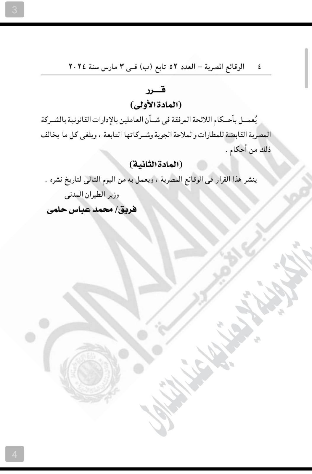 نشرت الجريدة الرسمية قرار وزير الطيران محمد عباس حلمي رقم 1383 لسنة 2023، بشأن العاملين بالإدارات القانوية بالشركة المصرية القابضة للمطارات والملاحة.