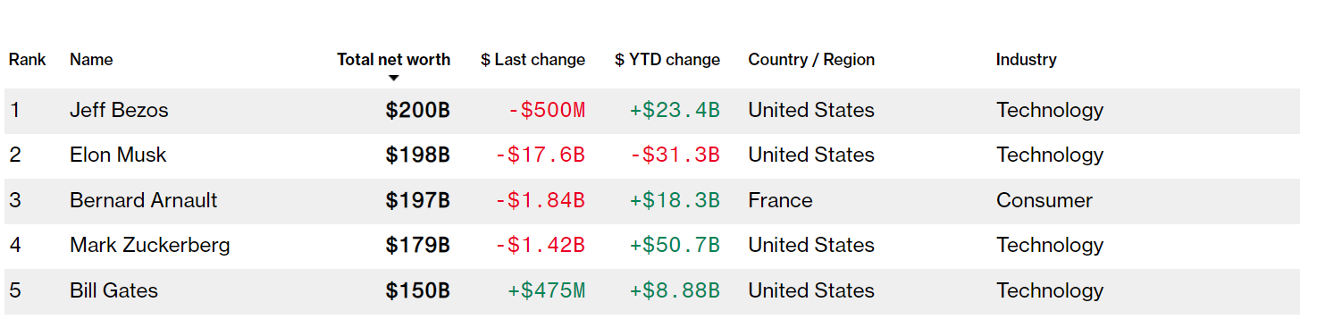 وثروة إيلون ماسك تبلغ حاليًا نحو 198 مليار دولار، في حين ثروة بيزوس تجاوزت 200 مليار دولار.